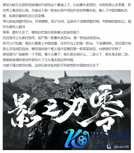 在《黑别传:悟空》大获告捷后,还有多款国产3A大作正在制作中,包括由灵游坊建造的《影之刃零》、505 Games制作的《明末:渊虚之羽》等。近日贴吧有玩家发帖吐槽,这些国产3A游戏为什么皆挤到“类魂游戏”这一条赛说念上了?激发网友们热议。
